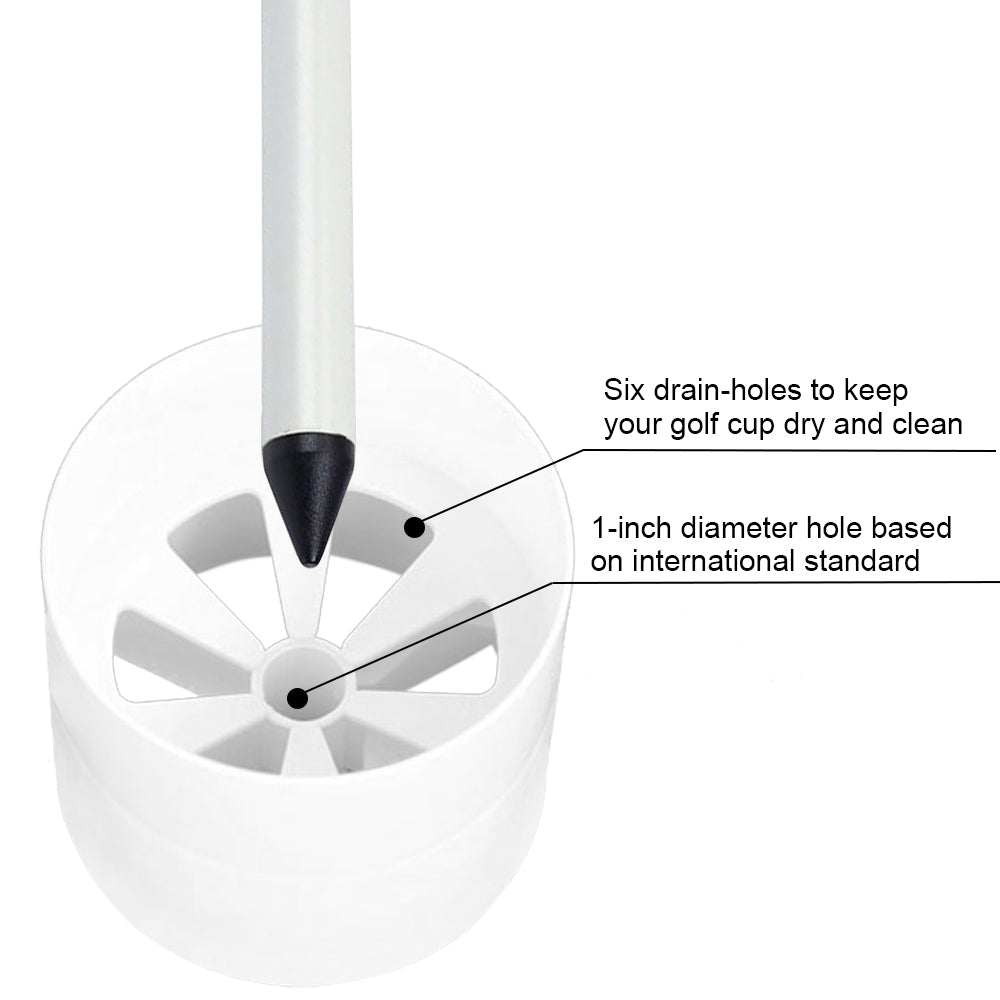 【6 Hole Putting Cup】This golf cup is made of high-quality ABS material, The golf cup is very environmentally friendly and durable. Its bottom is designed with 6 drainage holes, which can drain rainwater in time after rain, so that the golf hole cup is always kept dry and clean. So you don't have to worry about the accumulation of water in the hole, and you can have a relaxed and happy mood at any time.